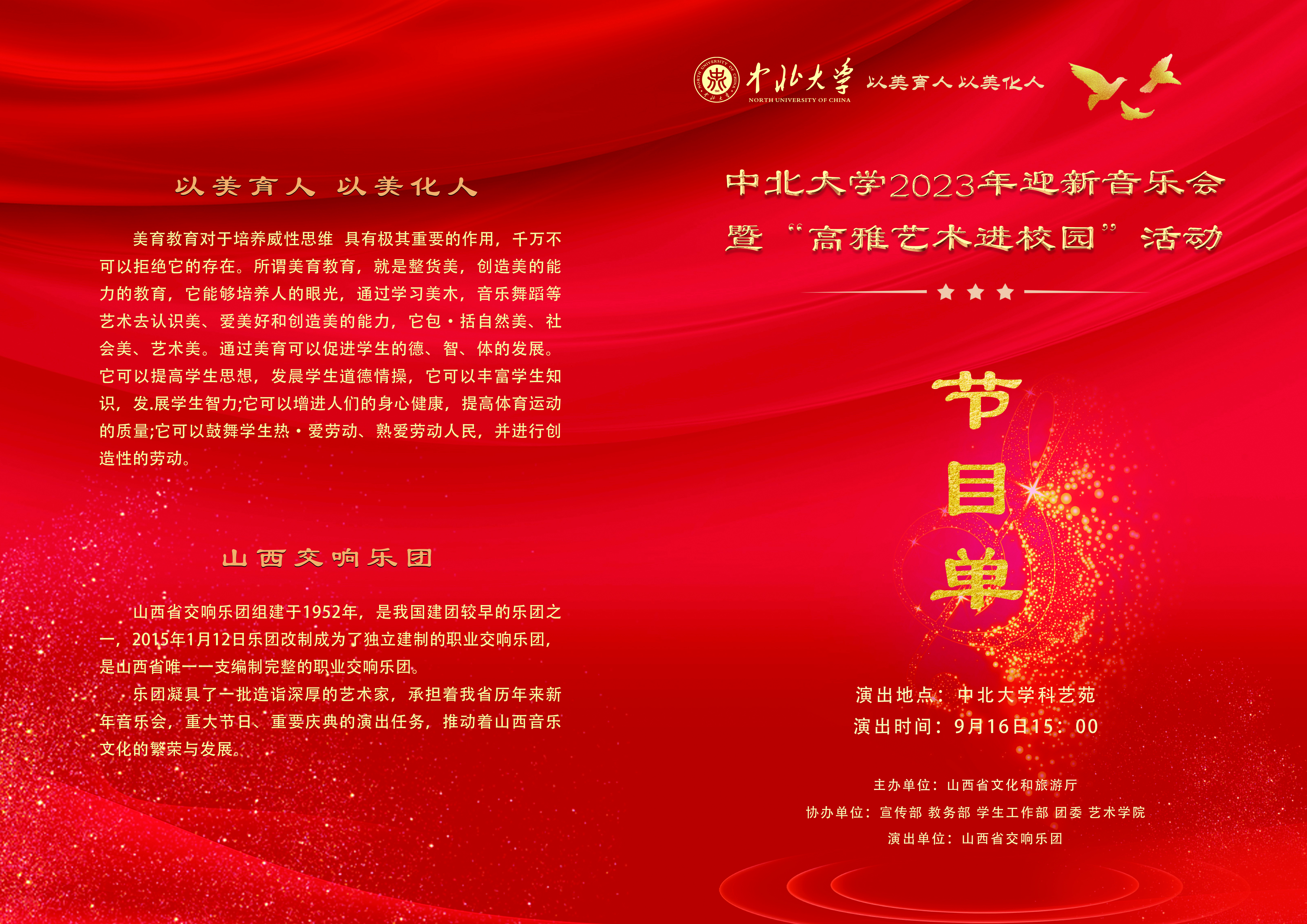 喜迎2023级新同学之际,为丰富校园文化生活,弘扬中华美育精神,以美育人、以美化人、以美培元,提高广大师生艺术素养,将高雅艺术融入校园文化建设,推动学习贯彻习近平新时代中国特色社会主义思想主题教育见实效,激励广大师生不断砥砺前行、奋发向上,特举办“中北大学2023年迎新音乐会暨高雅艺术进校园”活动,特邀山西省交响乐团为全校师生进行表演。现诚挚邀请全校师生届时欣赏!