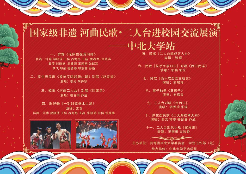 为促进文化交流,丰富校园文化,国家级非遗项目——河曲民歌二人台精品剧目校园交流展演于今天下午三点在科艺苑举行,欢迎广大师生前来观看。
