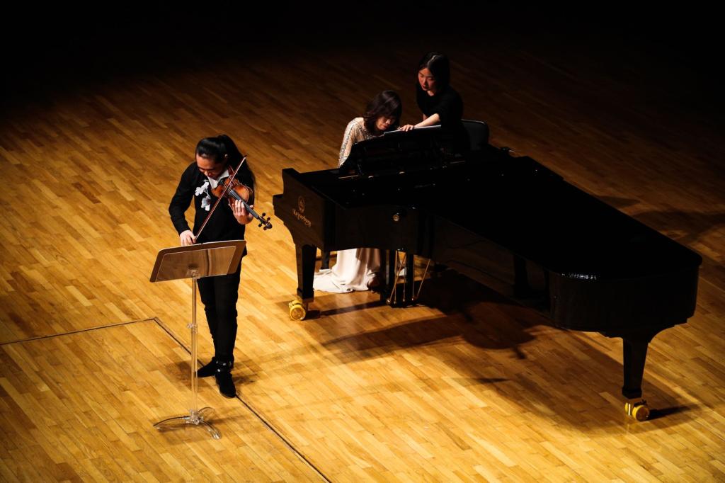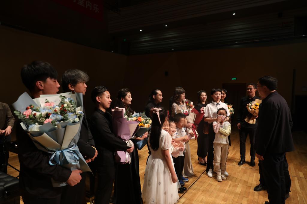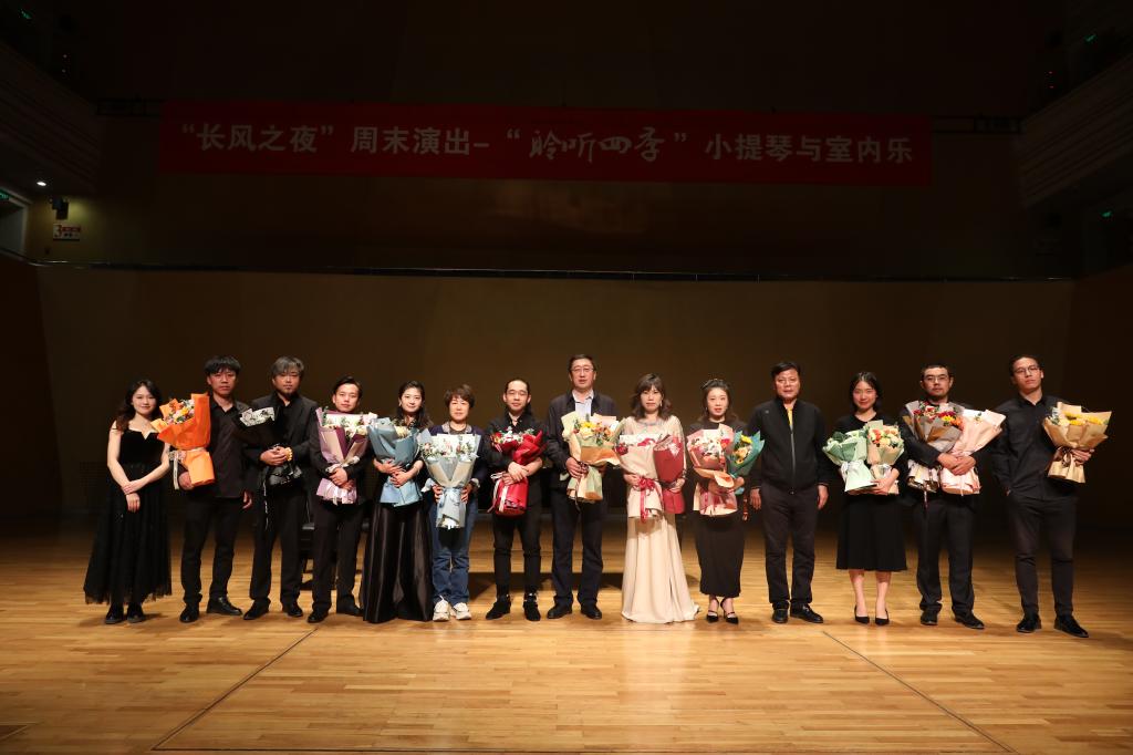 演出中,小提琴演奏充分发挥独特技巧,在音色与情绪的变化中展现出极高的音乐素养和演奏技巧;室内乐的演奏将不同民族的情感发挥的淋漓尽致。王威龙老师与王琼老师携手演奏爱德华-格里格《G大调第二小提琴奏鸣曲op.13》弗里兹-克莱斯勒《爱之悲》、德米特里-肖斯塔科维奇《第一小提琴协奏曲与第四乐章op.77》等5首经典作品;并与陆晨曦老师返场演奏爱德华-埃尔加《爱的礼赞》、巴勃罗《流浪者之歌》。董睿、温成皓、刘昱西、于鹏华、韩伟威等青年教师中场演绎德米特里-肖斯塔科维奇《五首小品为双小提琴与钢琴而作》、朱塞佩-托雷《D大调协奏曲》。演出近2个小时,弦音激越、琴声悠扬,呈现了一场无与伦比的绝美视听盛宴,赢得阵阵掌声。