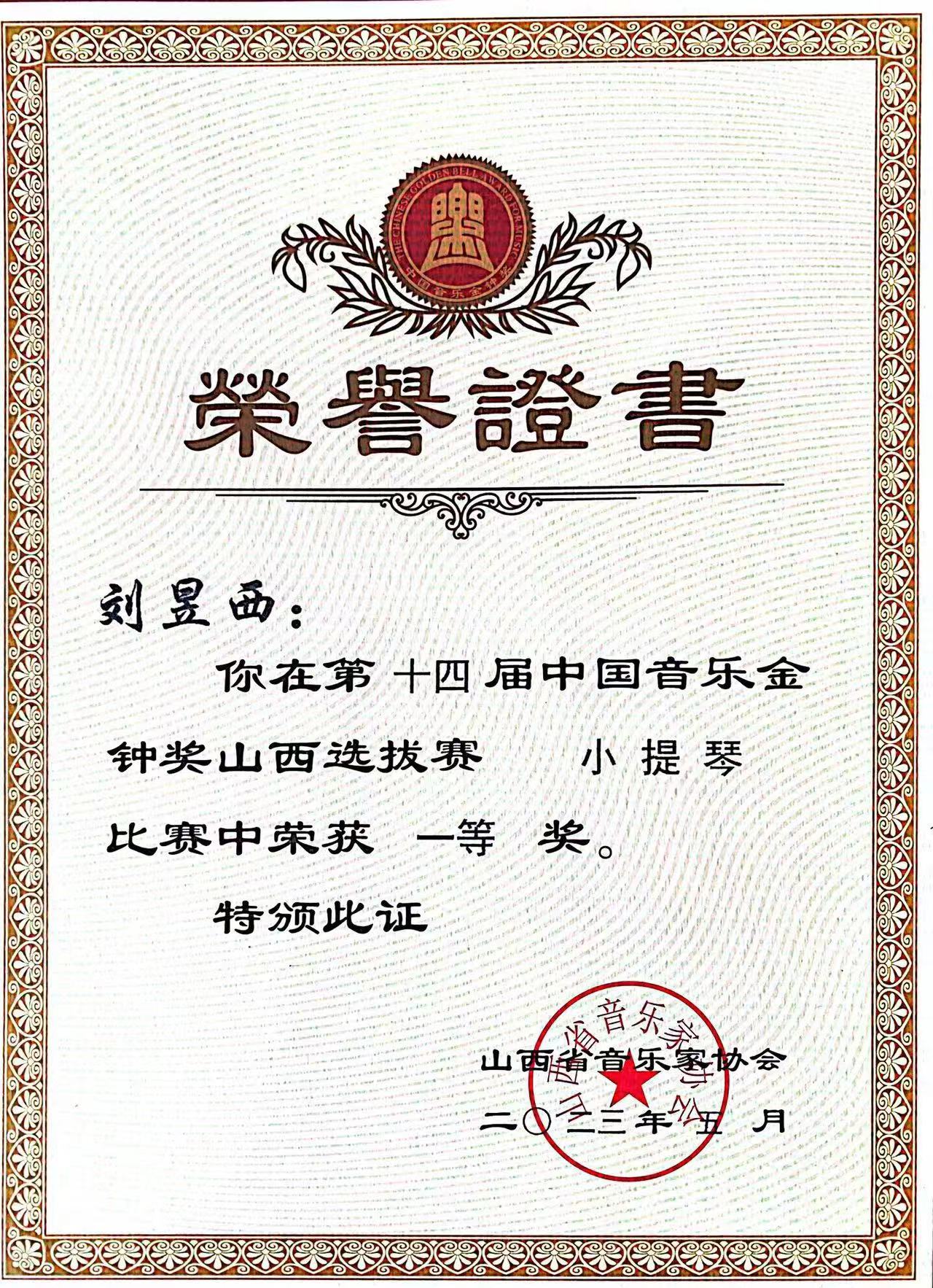 2023年4月18日—4月27日,由山西省文学艺术界联合会指导、山西省音乐家协会主办的第十四届中国音乐金钟奖山西选拔赛在太原举行,我校重庆时时彩 青年教师刘昱西荣获小提琴组一等奖,并进入全国选拔赛。