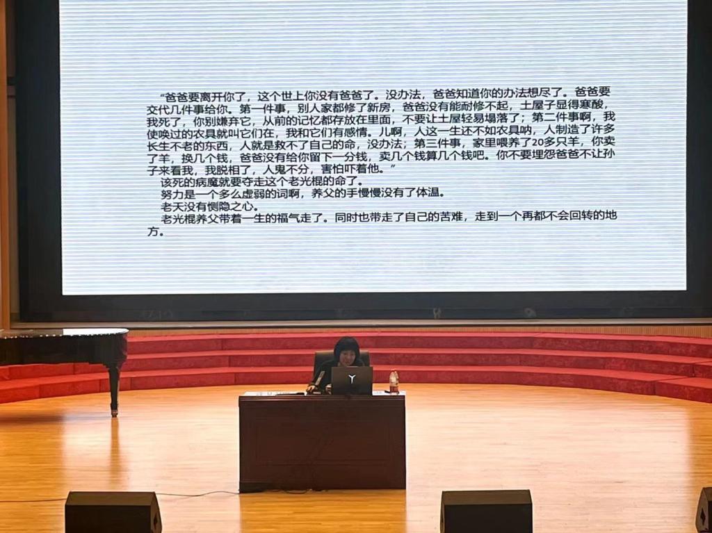 首先,王燕平院长详细介绍了葛水平教授写出的大量优秀作品以及获得的诸多荣誉,并感谢葛教授能够莅临中北大学分享小说创作的经验。讲座中,葛水平教授从自己的生活经历、成长环境、心灵感悟等多方面,述说自己的两部中篇小说《嗥月》和《喊山》的创作内容,分享自己文学创作时的构思及方法和心路历程。葛教授从一个创作者的角度,阐述小说与时代生活的关系,用朴实真挚的语言以自己的创作经历和人生体验为例深度解读,“有什么样的时代,就有什么样的文学和小说”。她表示:一个时代有一个时代的生活,好故事,一定具备强烈的“共情力”;一部好的作品是由故事力+交响力+共情力成就的,共情力会满足所有人的精神需求,而文学作为语言的艺术,打动人心的故事一定来源于最基层。