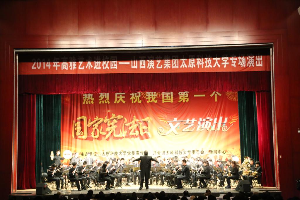在学科管理部主任、音乐总监与指挥李斌老师的带领下,全体管乐团的同学们,分别于2014年12月2日3日晚7点,圆满完成了由山西省教育厅、文化厅、山西演艺集团特邀获2014大学生“雏菊奖”大赛“一等奖”获得者,“中北大学青年交响管乐团”第六、七场高雅艺术进校园暨“太原科技大学与山西华澳商贸职业学院专场演出”的最后两场。