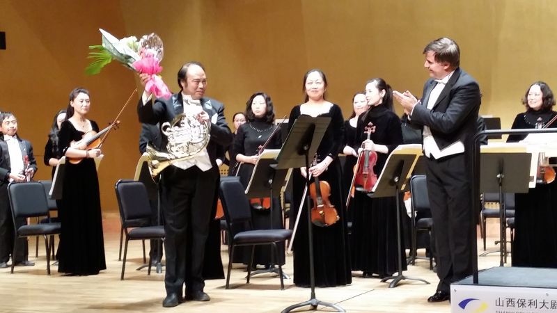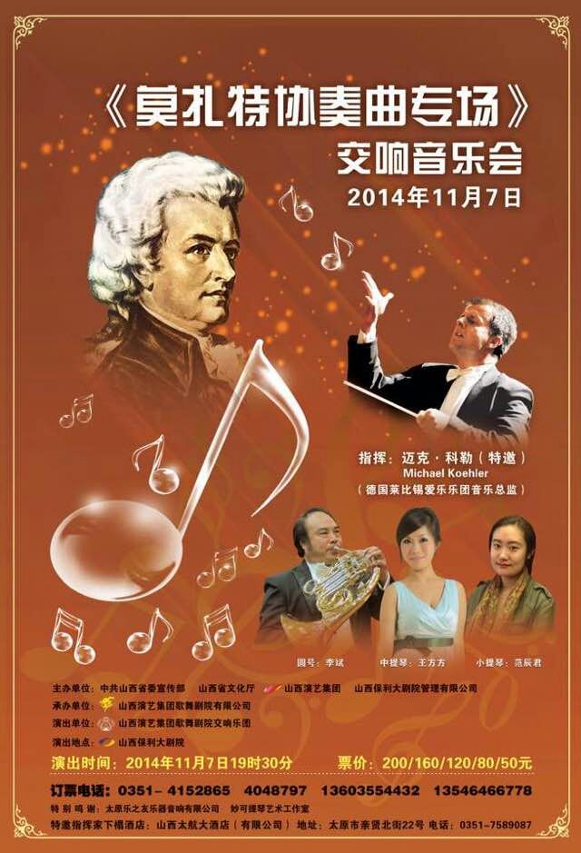 2014年7日晚19:30分,由中共山西省委宣传部、山西省文化厅、山西演艺集团主办,山西演艺集团歌舞剧院交响乐团承办的2014音乐季惠民演出“莫扎特协奏曲专场”交响音乐会,在座无虚席的山西保利大剧院音乐厅举行。音乐艺术学科管理部主任李斌老师应邀加盟本场莫扎特第三圆号协奏曲的独奏,李斌老师用他三十多年的舞台实践经验和精湛的圆号演奏技艺,把莫扎特作品诠释的恰到好处,赢得了在场观众热烈的掌声。指挥家德国莱比锡爱乐乐团音乐总监麦克说:李斌先生的圆号音色圆润透彻,非常富有魅力…..。山西交响乐团音乐总监德国指挥家艾拉胡.冯.艾伦巴赫说:非常感谢中北重庆时时彩