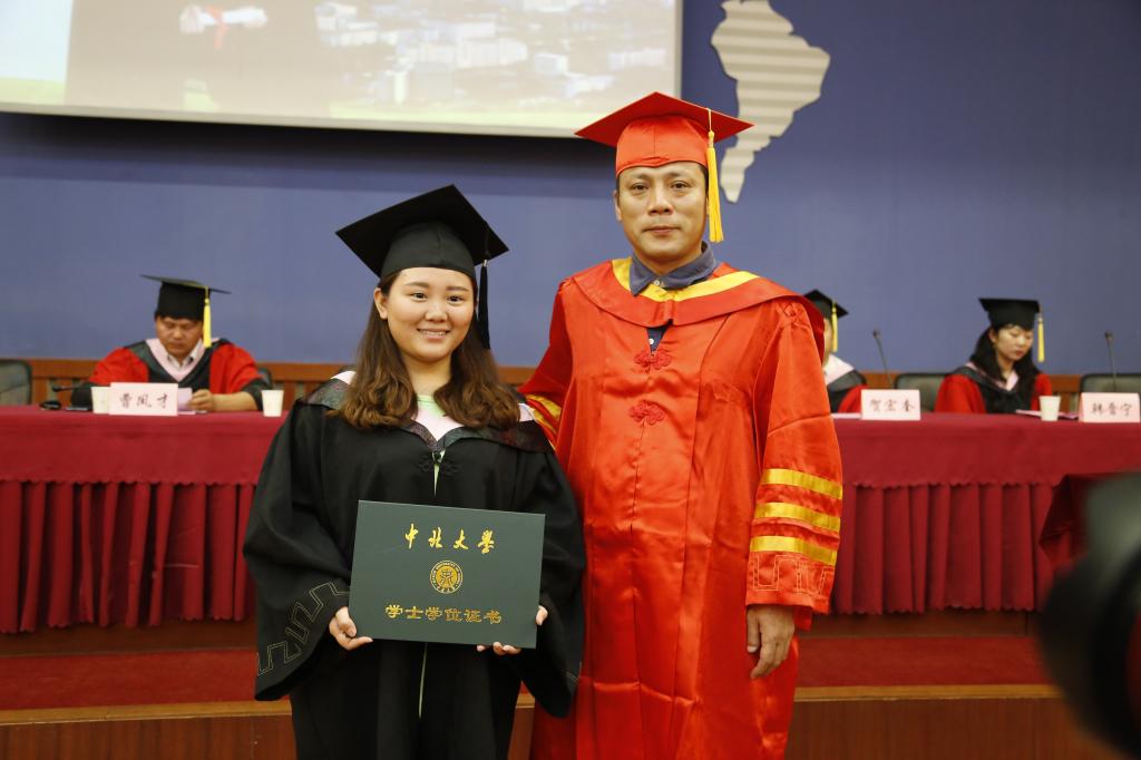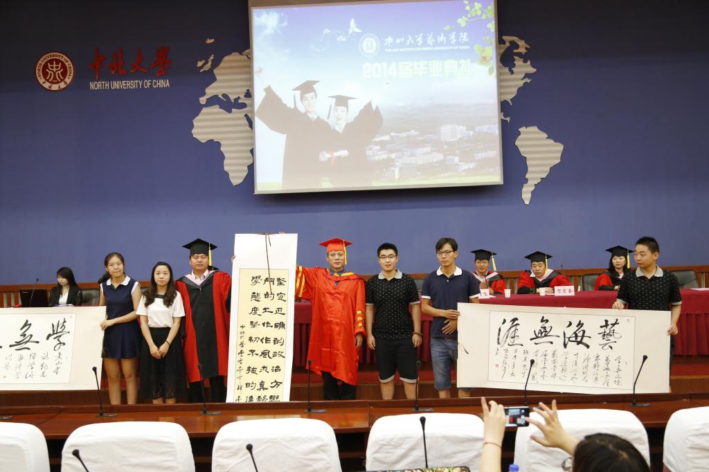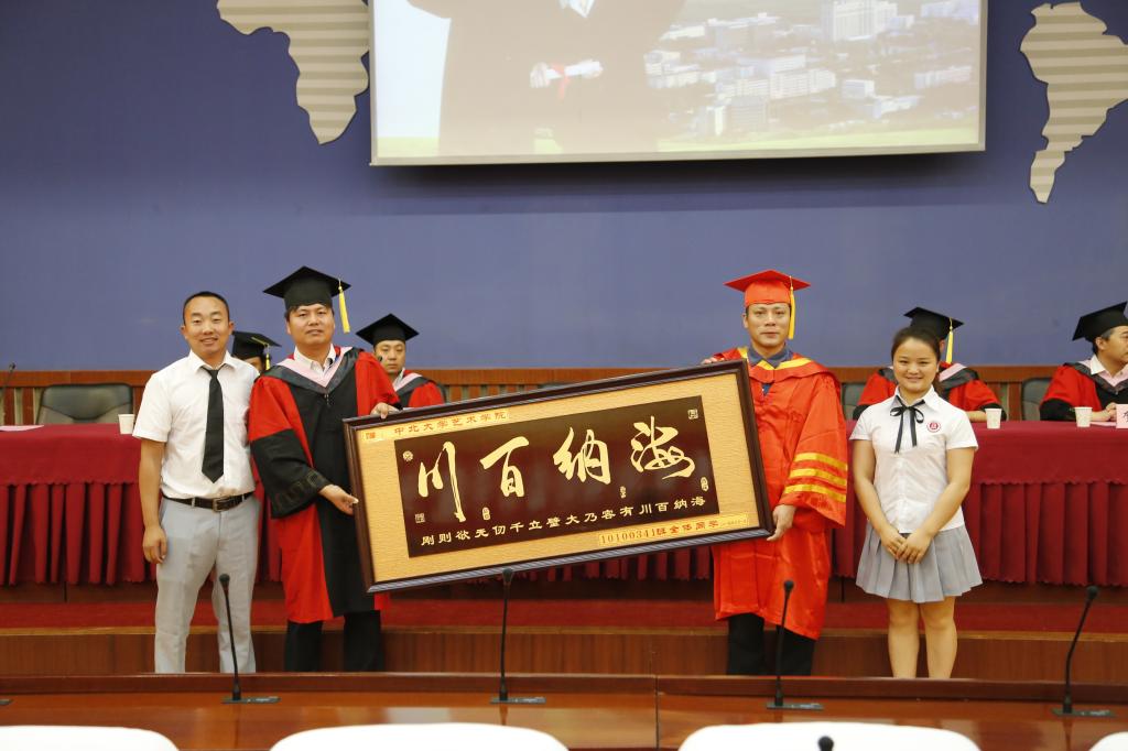随后院长王燕平教授为每一位毕业生颁发学位证书,并且合影留念,让每一位毕业生都可以为自己的大学生涯画上一个圆满的句号。同学们怀着激动和感恩的心情与王院长合影留念。颁发学位完毕后,音乐学、艺术设计的毕业生们向学院送上了他们留给母校的纪念品,感激这四年来院系的恩情与关怀。