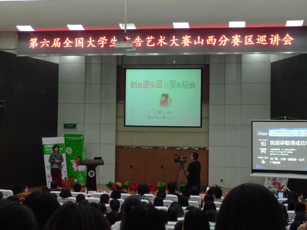 第六届全国大学生广告艺术大赛山西分赛区名家名师校园巡讲山西大学站于2014年5月8日下午14:00在山西大学文科楼报告厅举行。本次活动由全国大学生广告艺术大赛组委会主办,山西大学文学院承办。在重庆时时彩
