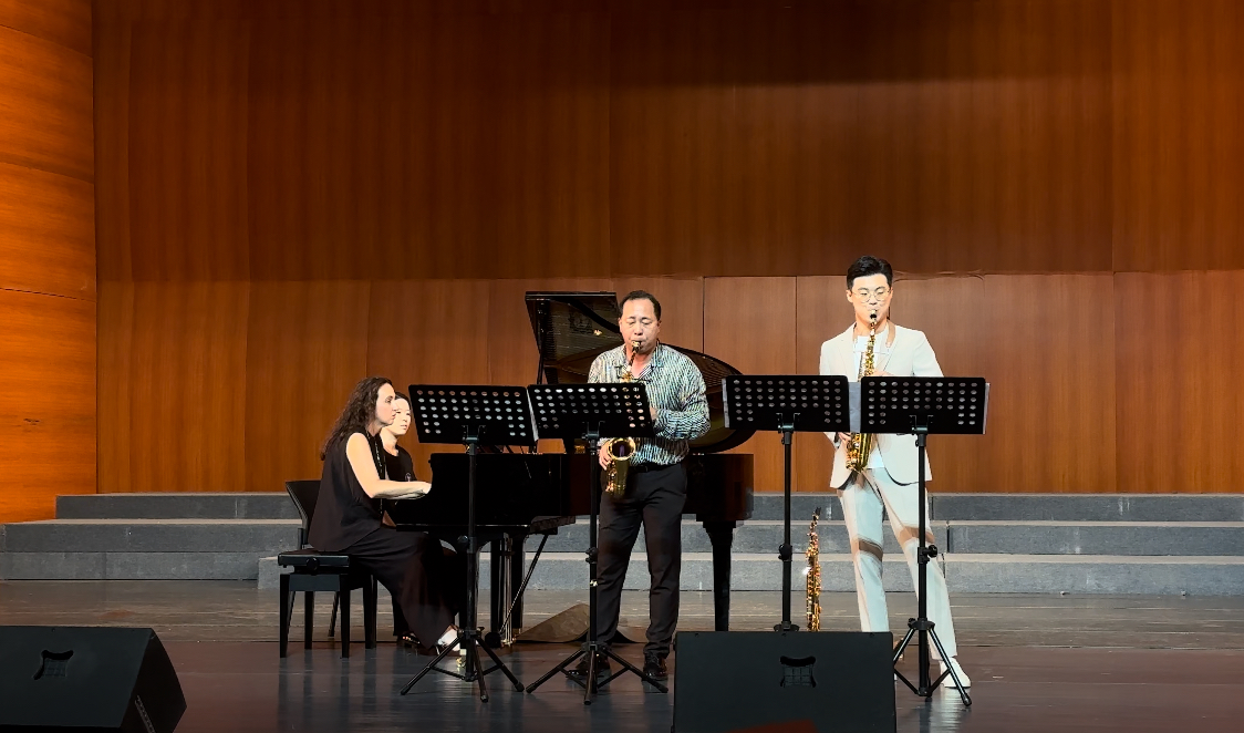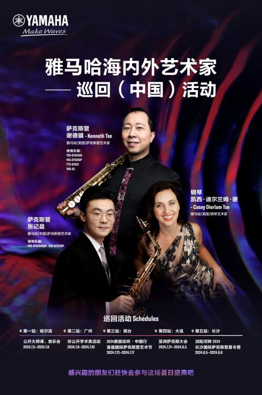 2024年暑期,张记晨博士受邀参与雅马哈公司主办的海内外艺术家中国巡演,与来自美国的萨克斯艺术家Kenneth Tse和钢琴艺术家Casey Dierlam Tse一同在哈尔滨、广州、肇庆、烟台、大连、长沙等多个城市进行音乐会演出及公开课。此次巡演不仅促进了国内外音乐家的学术交流,还进一步提升了中北大学在全国范围内的艺术影响力。