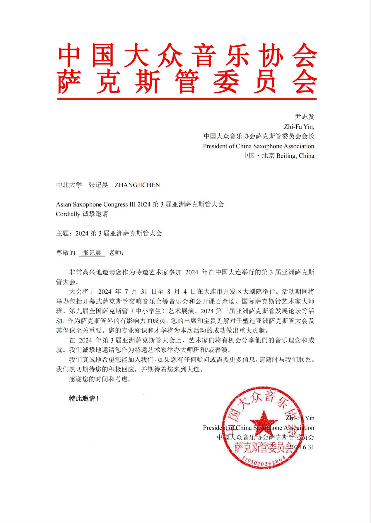 2024年7月31日至8月4日,第三届亚洲萨克斯大会在辽宁大连开发区大剧院成功举办,吸引了来自全球各地的萨克斯艺术家和学习者。张记晨博士作为特邀艺术家,不仅参与了音乐会演出,还担任展演比赛的评委。他的演奏获得了与会艺术家和观众的一致好评,充分展现了中北大学在音乐领域的强大实力。
