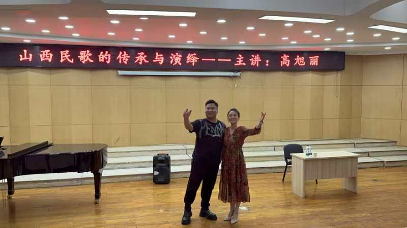讲座中,高旭丽老师对如何唱好山西民歌提出了自己的见解。她指出,唱好山西民歌不仅需要掌握正确的发声方法和演唱技巧,更需要对歌曲所蕴含的情感和文化内涵有深刻的理解和感悟。她鼓励同学们要用心去感受山西民歌的韵味和魅力,努力成为一名优秀的民歌传承人。最后,高旭丽老师特邀我省著名青年男高音歌唱家乔佳共同演绎了《想亲亲》等山西民歌。