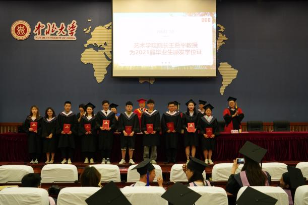 院长王燕平教授在致辞中代表学院向圆满完成学业的全体2021届毕业生表示热烈的祝贺,向悉心教导他们的老师、辛勤养育他们的父母致以最诚挚的敬意和衷心的感谢。他深情回顾了毕业生同学们在校园中学习、生活的点点滴滴,感谢同学们对学院发展建设作出的积极贡献。他希望毕业生们能传承和发扬母校优良传统,勇敢地承担起中北人的接力棒,不忘初心、坚守艺术理想,书写灿烂辉煌的人生篇章。