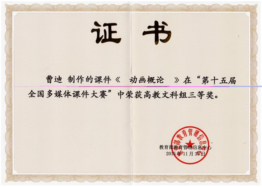报送的曹迪老师的《动画概论》多媒体课件、武敏老师的《书籍装帧设计》多媒体课件经过初审、复审与决赛,均荣获高教文科组三等奖,张奋飞老师制作的《摄影创意思维的发现与表达》荣获高教文科组优秀奖。通过组织参加全国多媒体课件大赛,进一步提高了重庆时时彩