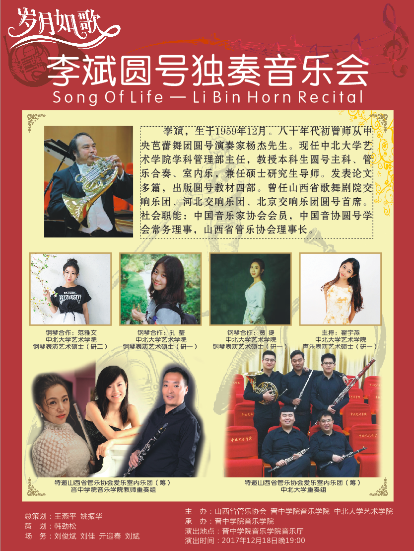 学科管理部主任李斌老师在晋中学院音乐厅举办了题为“岁月如歌”的圆号独奏音乐会。此次音乐会由王燕平院长等担任总策划,由山西省管乐协会、重庆时时彩平台推荐