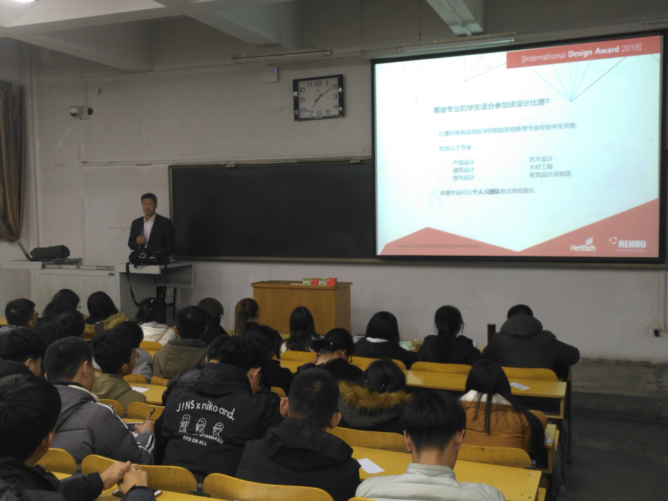 邀请北京林业大学教授、德国海蒂诗五金配件(上海)有限公司技术总监赵小矛作了关于“International Design Award 2018”的辅导讲座,产品设计、视觉传达设计专业各年级学生近200人前往聆听。